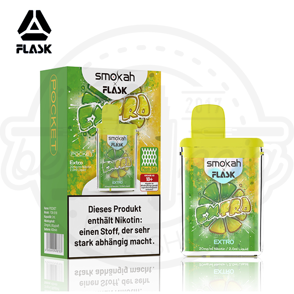Flask X Pocket Einweg Vape - Extro 20mg Eine Mischung aus Zitrone und Limette. Die Flask X Pocket Einweg E-Zigarette ist ausgelegt auf ca. 600 Züge und besitzt eine Zugautomatik, einen vollgeladenen 4..